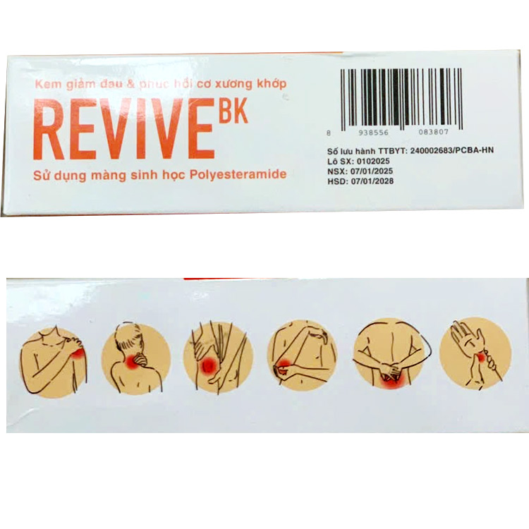 Kem giảm đau và phục hồi cơ xương khớp REVIVE BK là một sản phẩm không có chứa thuốc, hoạt động dựa trên công nghệ điện sinh học tự sinh trong cơ thể con người để có thể tái tạo và phục hồi tổn thương cho hệ thống cơ xương khớp – bằng cách sử dụng màng sinh học Polyesteramide.
