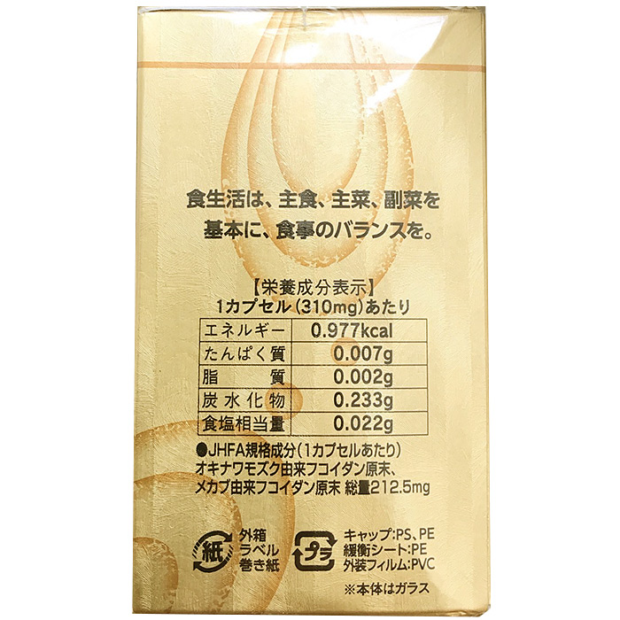 Thành phần: Chiết xuất rong biển chứa Fucoidan (Mozuku, Mekabu) (sản xuất tại Nhật Bản), dextrin, bột chiết xuất sợi nấm Agaricus/HPMC.
