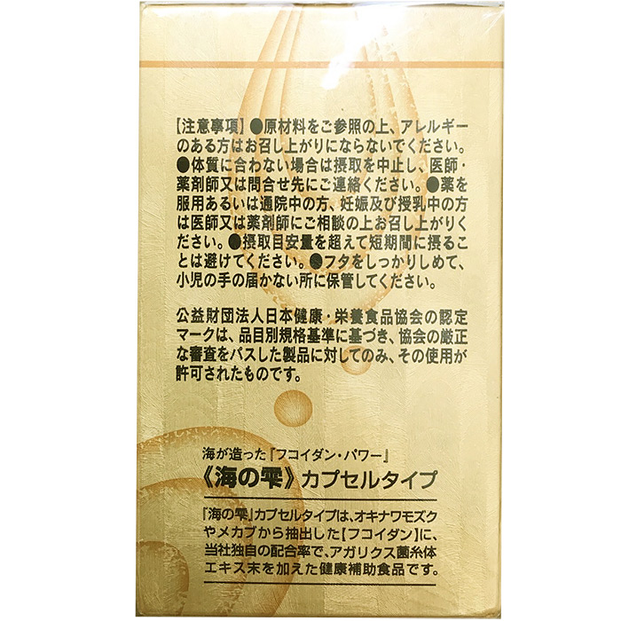 Viên nang “Fucoidan – Umi no Shizuku” là một loại thực phẩm bổ sung sức khỏe được tạo ra bằng cách thêm chiết xuất sợi nấm Agaricus vào Fucoidan được chiết xuất từ tảo nâu Mozuku và tảo nâu Mekabu của Okinawa, sử dụng tỷ lệ pha trộn độc quyền riêng của công ty. Đây là các thành phần tương ứng được lấy từ biển (Fucoidan) và đất liền (Agaricus).